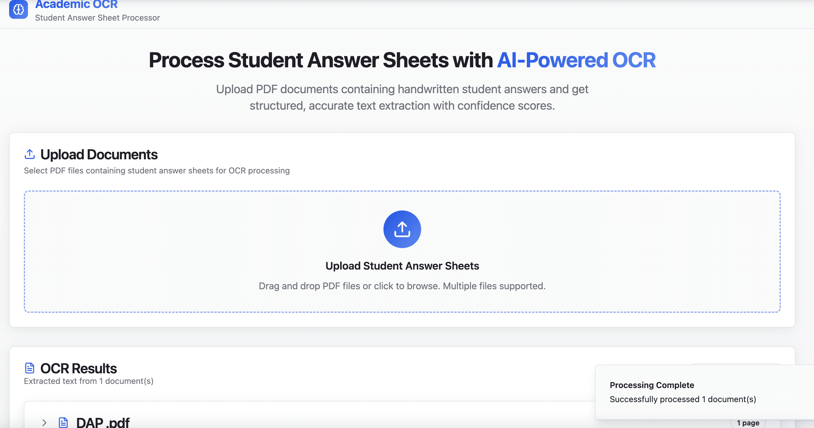 An AI-driven document intelligence system designed to digitize handwritten and scanned documents with high accuracy. The platform leverages computer vision and OCR models to extract text, detect document structure, and convert unstructured inputs into clean, searchable digital records suitable for analysis and long-term storage.